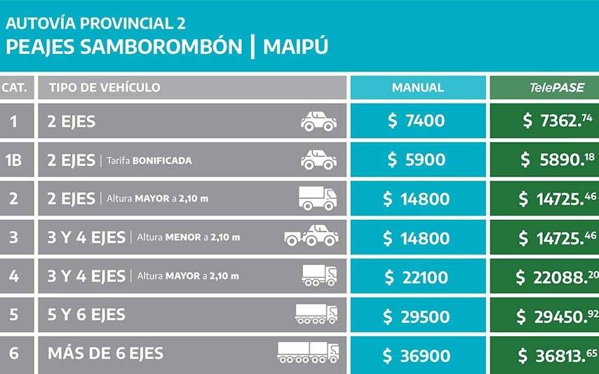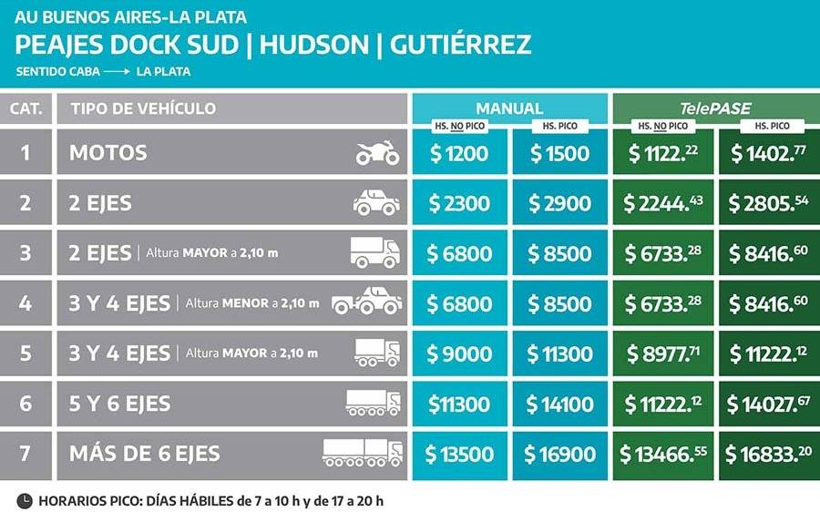 Los peajes con dirección a La Plata —Dock Sud, Hudson y Gutiérrez—, la tarifa para la misma categoría es de $2.300 en horario habitual y asciende a $2.900 durante las horas pico.