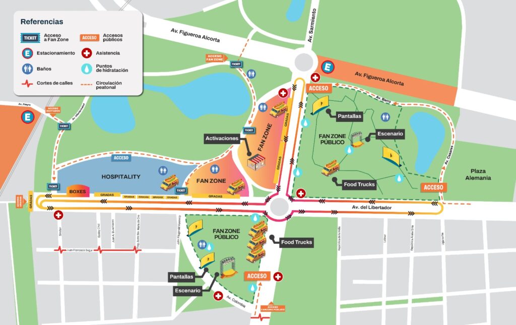 - Acceso de Vecinos: Los residentes podrán ingresar a sus domicilios presentando el DNI con dirección en la zona. Tendrán sectores preferenciales en Av. del Libertador (entre Sinclair y Kennedy, y entre República de la India y Árabe Siria).