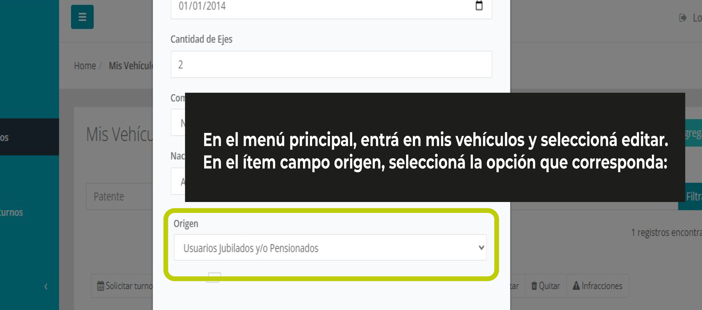 En el menú principal, entrá en mis vehículos y seleccioná editar. En el ítem campo origen, seleccioná la opción que corresponda: